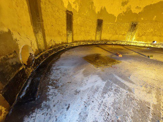 The tank was suffering from multiple through-wall defects both internally and externally. ICR was tasked with providing engineered repair solutions with a two-year design life, as well as supplying equipment and personnel to complete both the full circumference external repair and the internal reinforcement works.